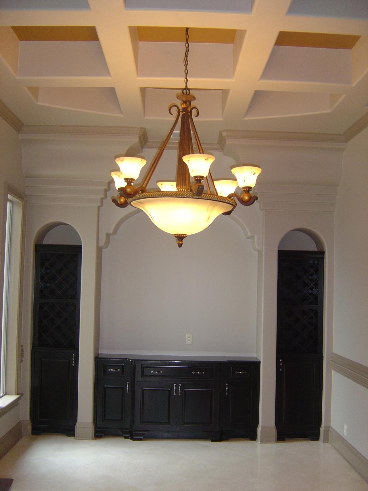 - Formal Dining Area with accented waffle ceiling, built-in wine cabinets & buffet with granite top and large alabaster chandelier.