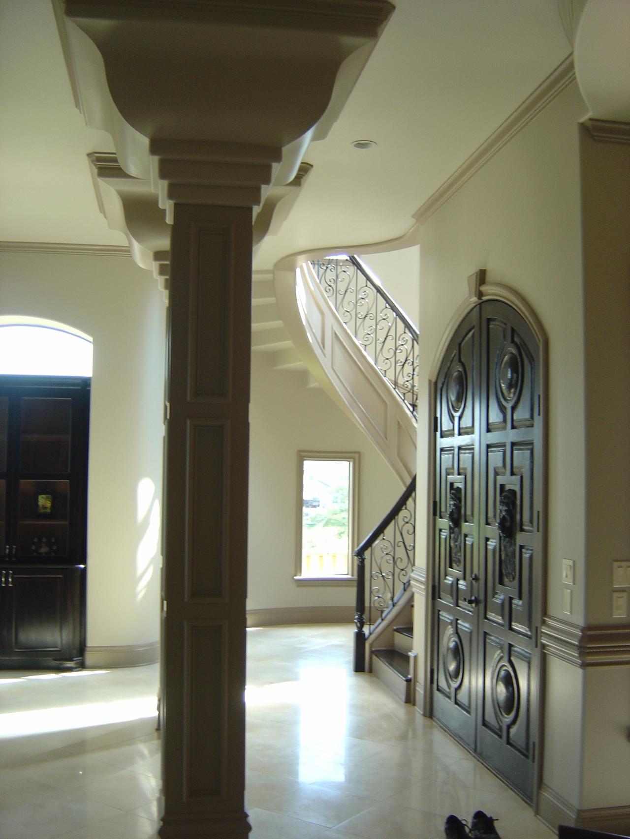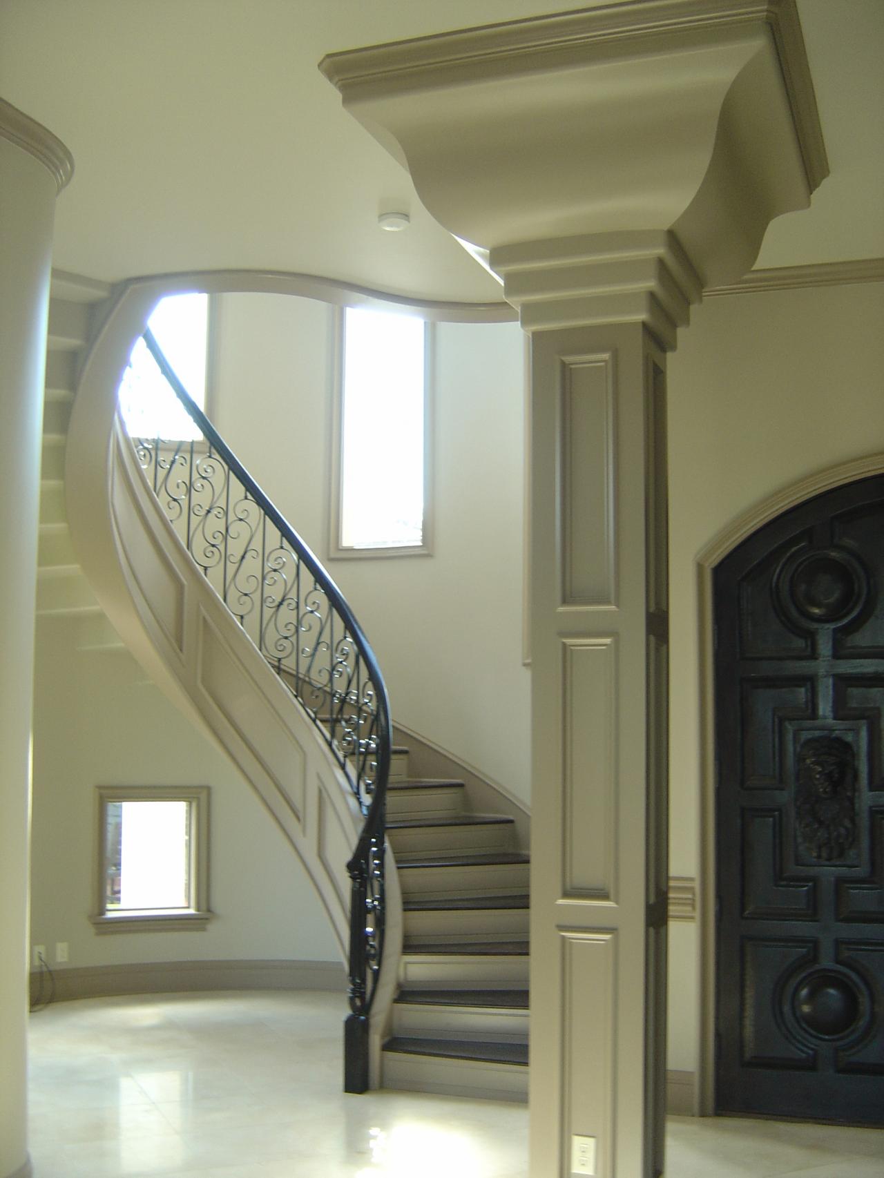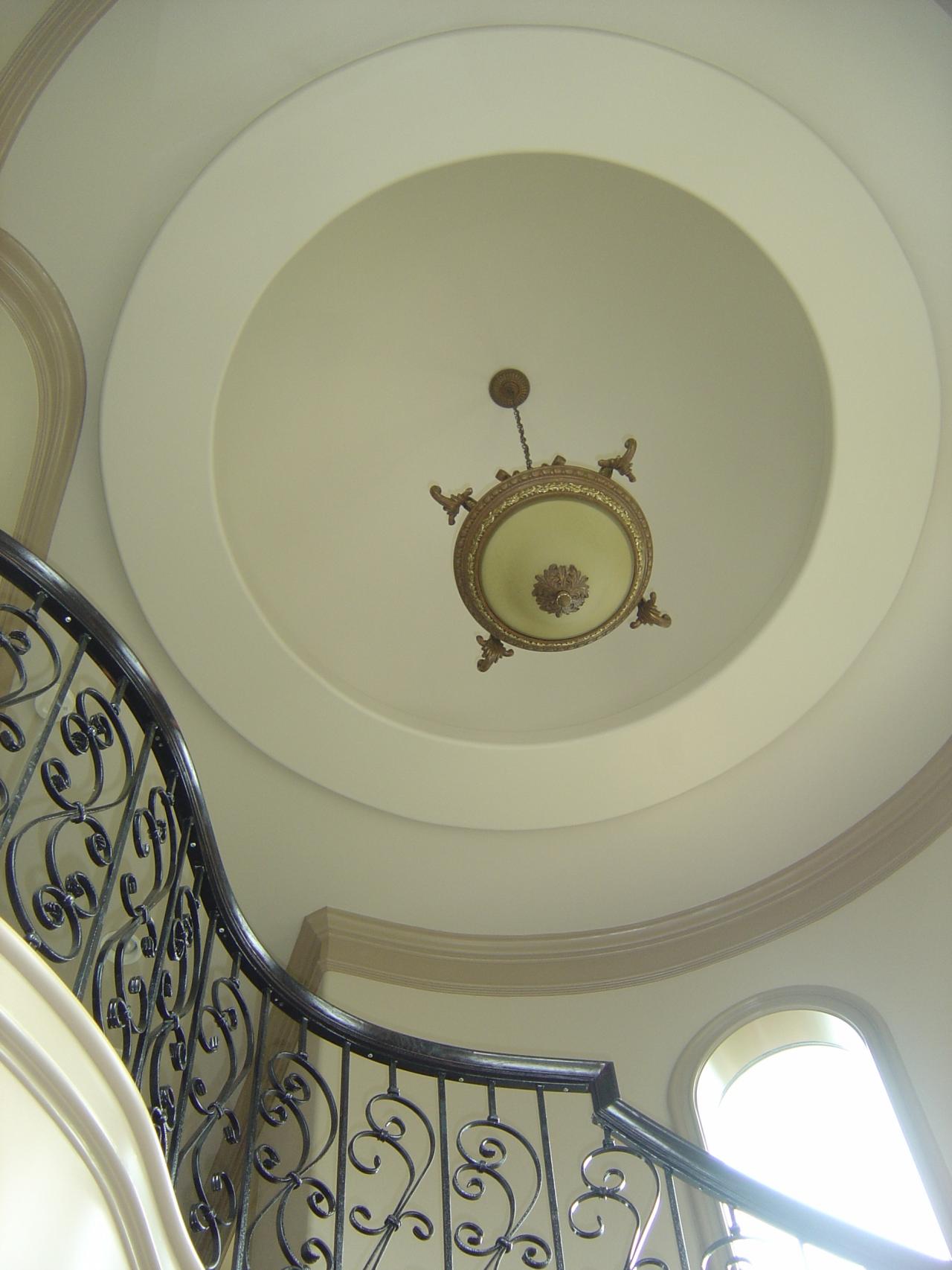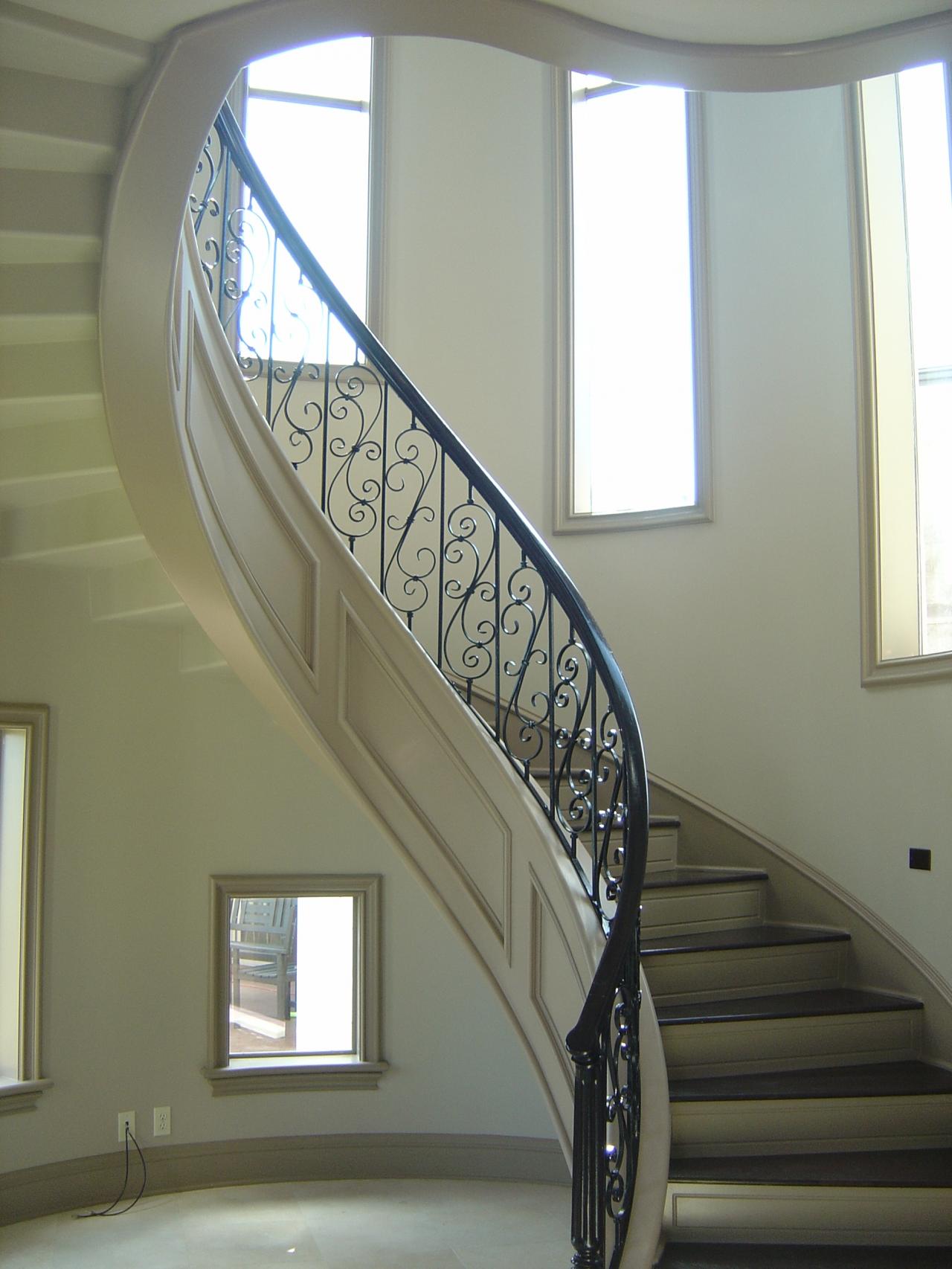 - Free-standing circular staircase with paneled curved stringer, hardwood steps, custom routed risers, scrolled & curved wrought-iron rail and hand bent hardwood cap finished with a dome ceiling.