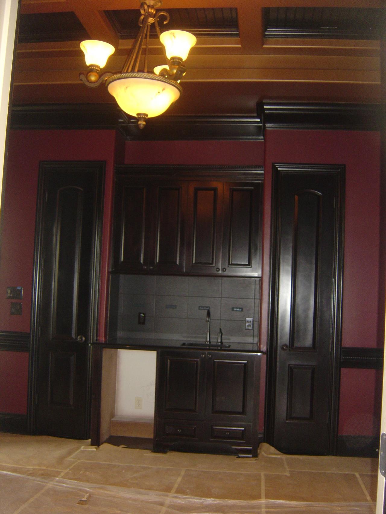 - Designer Stained study with French doors to courtyard, Wet bar and refrigerator, 8 inch rope chair rail, two-step crown moldings, 8 inch base boards, waffle wood ceiling, hardwood floors and alabaster chandelier.